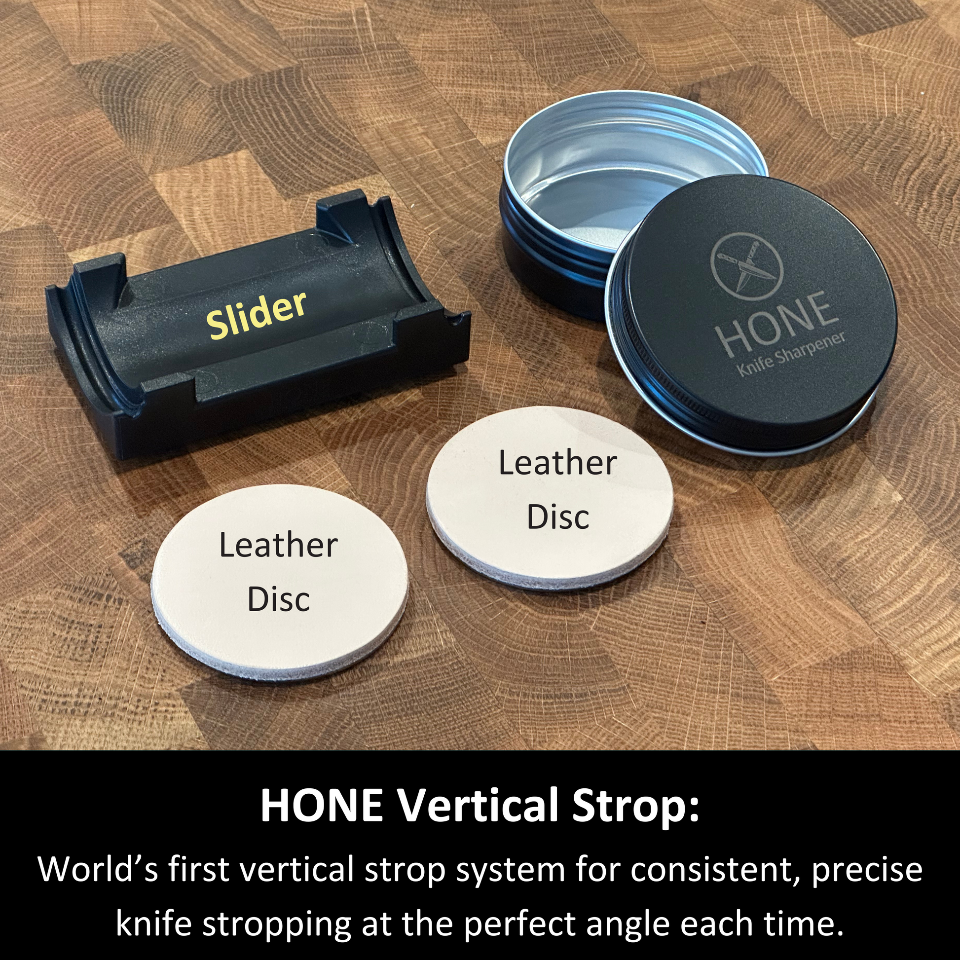 The HONE Vertical Strop is the world’s first vertical strop system, designed to solve the common challenge of maintaining a consistent knife angle during stropping. Traditional methods often lead to inconsistent angles, resulting in ineffective sharpening. Our innovative system ensures that your knife is always stroked at a specific, precise angle, making it easier than ever to achieve a razor-sharp edge every time.